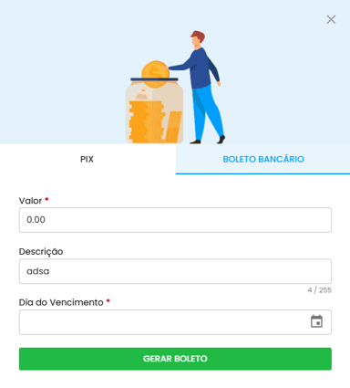 • Boleto Bancário: Informe os dados: valor, descrição e data de vencimento. Em seguida, clique no botão verde “Gerar Boleto”. Agora, basta efetuar o pagamento.