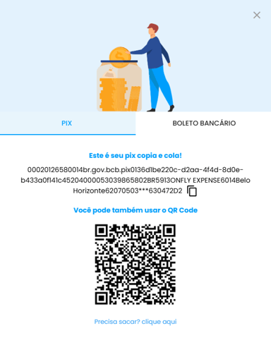 • PIX: Copie o código PIX gerado ou escaneie o QR code para fazer o pagamento.